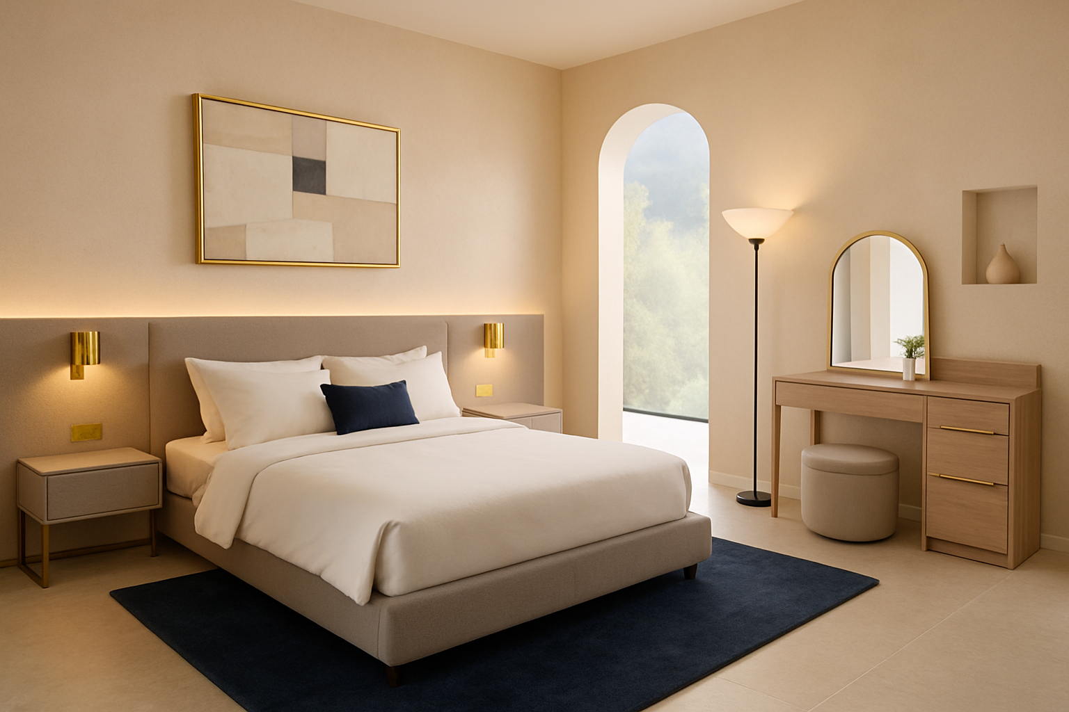 고급스러운 인테리어의 핵심은 절제입니다. 색상 수를 2~3가지로 제한하고, 명도 차이를 줄여 부드러운 흐름을 만드는 것이 중요합니다. 너무 강한 대비는 산만함을 유발할 수 있으며, 공간의 전체적인 조화가 깨질 수 있습니다. - 골드와 브론즈, 금속 포인트의 활용