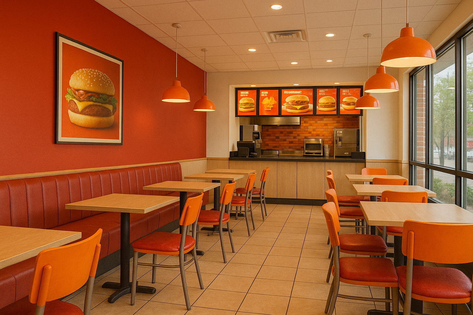레드와 오렌지 색상은 뇌를 자극하여 식욕을 증진시키는 대표적인 색상입니다. 패스트푸드점이나 한식당처럼 빠른 회전율과 높은 테이블 회전을 추구하는 매장에 적합합니다. 다만 전체 공간에 과하게 적용하면 피로감을 줄 수 있으므로, 벽면 일부나 포스터, 의자 등에 국한하여 사용하는 것이 좋습니다. - 그린·내추럴 우드 톤