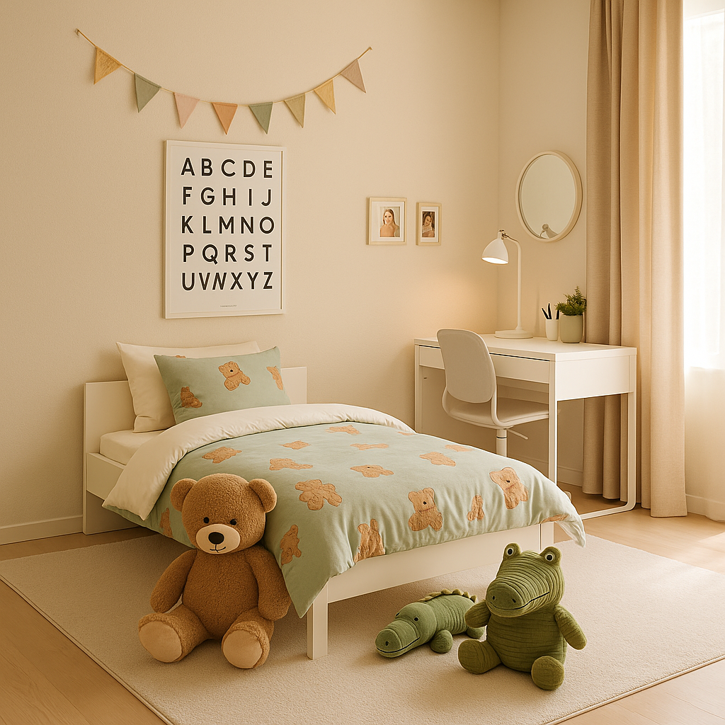 장난감이나 침구, 포스터 등 소품에 컬러 포인트를 두면 전체 공간에 활기를 주되, 과도한 자극은 줄일 수 있습니다. 특히 컬러를 활용한 교육적 요소(예: 알파벳, 동물 그림 등)를 넣는다면 인지 발달에도 긍정적인 영향을 줄 수 있습니다.